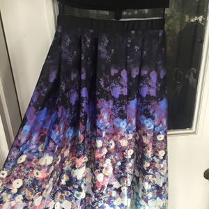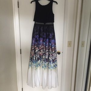 Floral print ombré A-line gown. Mesh panel design connecting the crop top and high waist skirt. Hidden back zipper with hook and eye closure. Worn once, great condition. Small dirt stain on the bottom of the skirt, not noticeable when on.