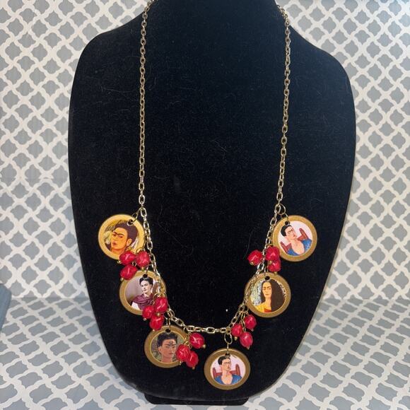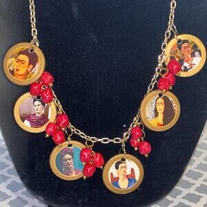 Long Frida Kahlo Goldtone Red Beaded Reversible Necklace Handmade Artisan New
