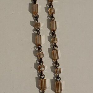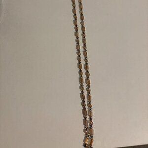 This is a 30 inch gold Beaded necklace with copper. It's long and not chunky. The gold beads glow in the light.