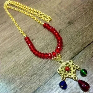 Long Gold Tone Chain Necklace with Red Beads and Pendant with Bead Accents