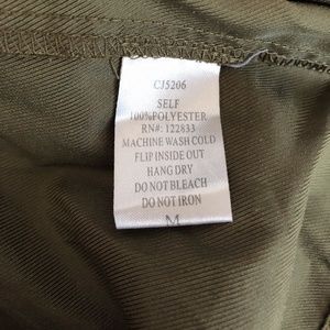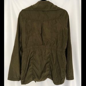 Lightweight, thin, long, and scrunched at the waist. Zip-up front with snap button at the bottom. Two button-closed pockets. Fasten rolled up sleeves with strap and button.