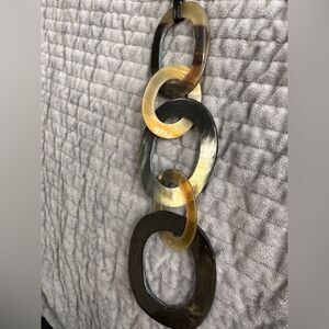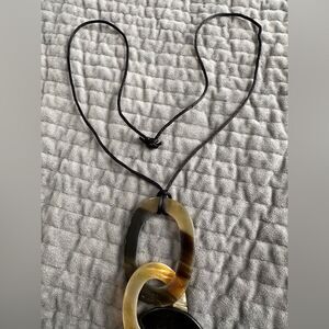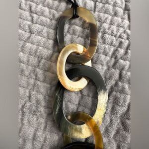 A striking statement piece, this long pendant necklace showcases bold interlocking links in a mix of organic horn-style hues, suspended from a sleek adjustable black cord. Perfect for layering or wearing solo, this lightweight necklace enhances both casual and dressy looks.