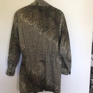 Longer animal print jacket, zipper front and adjustable waist.