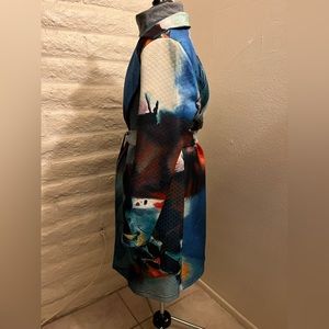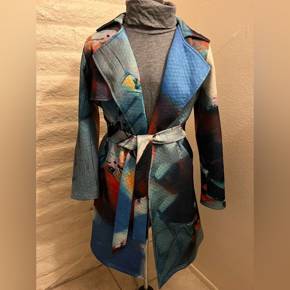 Brand is Radzoli, it’s a mid weight quilted jacket. Amazing abstract design. Super comfortable, I’m just needing to clear out my collection!!! Small snag on collar, as pictured, otherwise in great condition. Generous Medium, can fit Large.