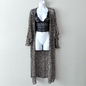 Embrace elegance with this stunning leopard print kimono. Bell sleeves. Can be used for a bikini or bathing suit cover up. Perfect for adding a touch of wild sophistication to your wardrobe. In excellent condition.