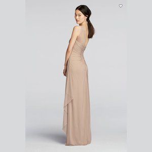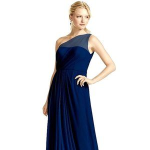 This long mesh bridesmaid dress is the definition of graceful, with an illusion one-shoulder and side cascade that falls beautifully down the length of the dress.