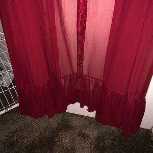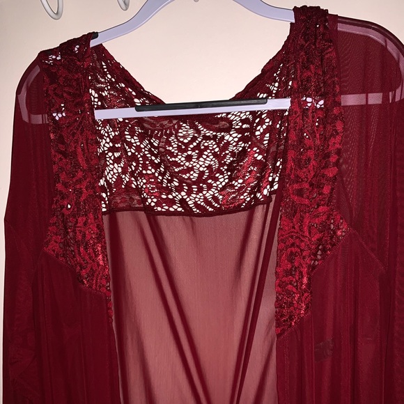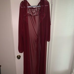 Long red mesh robe. Lace top and tie. Floor length.Very sexy! Never worn. No rips,stains. In prefect condition. Says it’s a 3X fits more like a 1x or XXL.