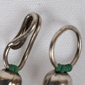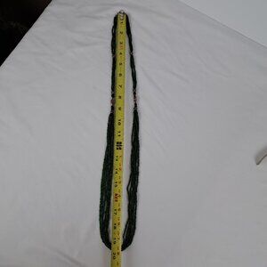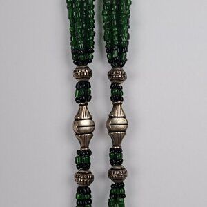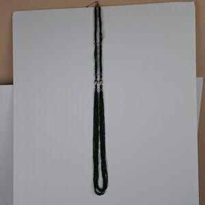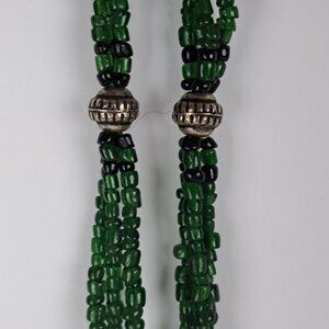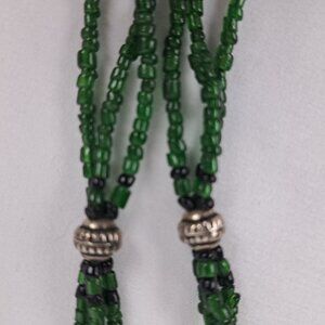 Long Multi Strand Green Glass Seed Bead Necklace w/ Silver Tone Beads and a few Black Glass Seed Beads. 3 strands of beads at the 2 top sections and 6 strands of beads at the bottom section. Pretty green color. Great for the holidays or everyday. No makers mark; listed under vintage. Preowned; some light tarnish on the hook. Please see pictures for approximate measurements. Boho, Hippie, festival, holidays, events.