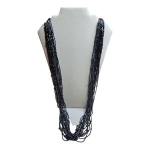 Multi stranded long necklace with seed beads and small beads. Steel blue in color.