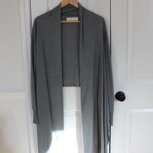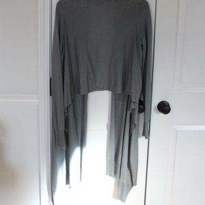 Drapey, open-front grey cardigan. Fitted sleeves, long in the front and short in the back. Ribbed detailing at bottom of sleeves and long ends.