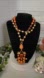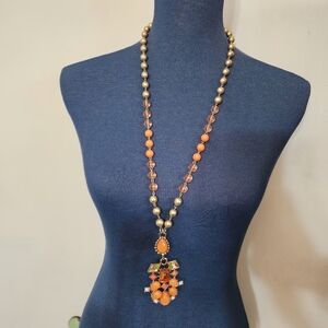 Long Orange and Gold Bead Necklace with Geometric Pendant