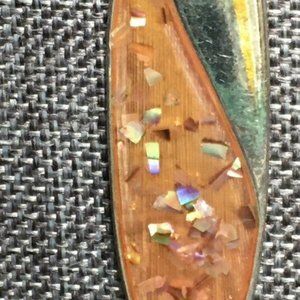 Beautiful, retro style long oval pendant with half silvertone and half peachish amber colored with chunky glitter suspended, Silvertone slinky cord necklace and beads!