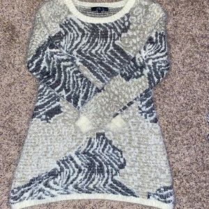 This is long, patterned (zebra and cheetah), fuzzy, black, cream, and gold sweater!! It is super soft and comfortable!