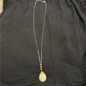 Statement necklace featuring a long gold-tone chain accented with pearl-style links and a large teardrop-shaped natural stone pendant. Wire-wrapped detailing at the top of the pendant adds a handcrafted touch. Measures approx. 16” drop. Lightweight yet eye-catching—perfect for layering or wearing solo. NWOT.