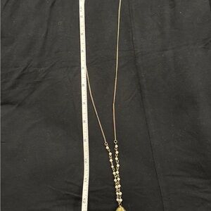 Statement necklace featuring a long gold-tone chain accented with pearl-style links and a large teardrop-shaped natural stone pendant. Wire-wrapped detailing at the top of the pendant adds a handcrafted touch. Measures approx. 16” drop. Lightweight yet eye-catching—perfect for layering or wearing solo. NWOT.