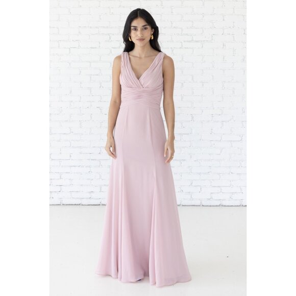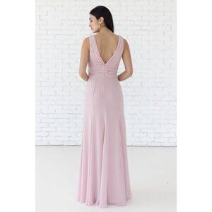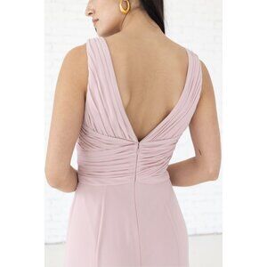 Long chiffon bridesmaid dress with wide straps. Fit and flare. Color: Chateau Rose--a dusty pink. Size M (Size 6-8) Size chart in photos. Bust 35-36" Waist 39-30" Hips 40-41" Store sample. No alterations.