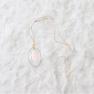 Stone is a very pale pink. It floats inside this gold hoop attached to a leather strap. Super pretty! Some texture in the gold medal and minor tarnishing