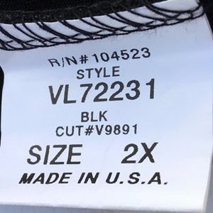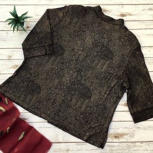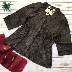 Classic vintage black jacket with gold print, Mandarin collar, black buttons down the front and shoulder pads. Where it as a jacket or with leggins. 90% acetate and 10% spandex. Size 2X, measures about 27 inches from armpit to armpit and 27 inches in length. Sleeves are about 17.5 inches long. D