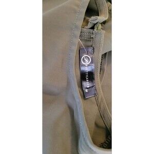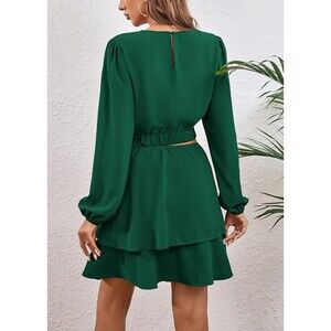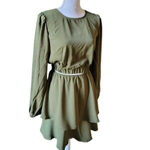Long Puff Sleeve Cut Out Olive Green Tiered Ruffle Pleated Short Dress Sz M