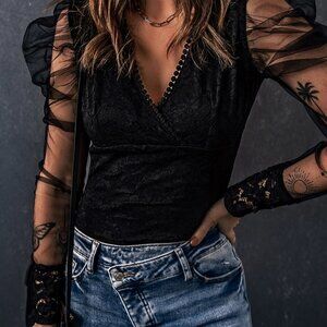 Svetle Chic Long Puff Sleeve V-Neck Lace Bodysuit.The intricate lace detailing adds a romantic and feminine touch, making it perfect for date nights or special occasions.