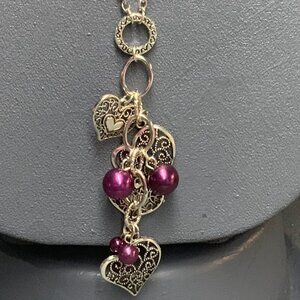This elegant necklace features a delicate silver-tone chain adorned with intricate filigree heart pendants and vibrant purple faux pearl beads. A timeless accessory that adds a touch of sophistication to any outfit.