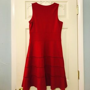 Very pretty red dress - great for weddings! Size 6. Forgiving material, perfect for many body types :)