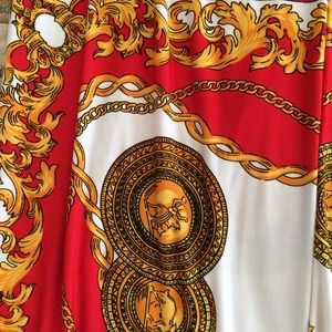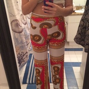Long comfortable pants. Versace like prints. Very colorful and fun. Spandex, silky feel. Long, stretchable