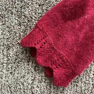 Stylish sweater goes perfectly over dressy or casual clothes. Pictured on 5 foot 2, 110 lb person. Is a size S but shrunk in dryer to xs size