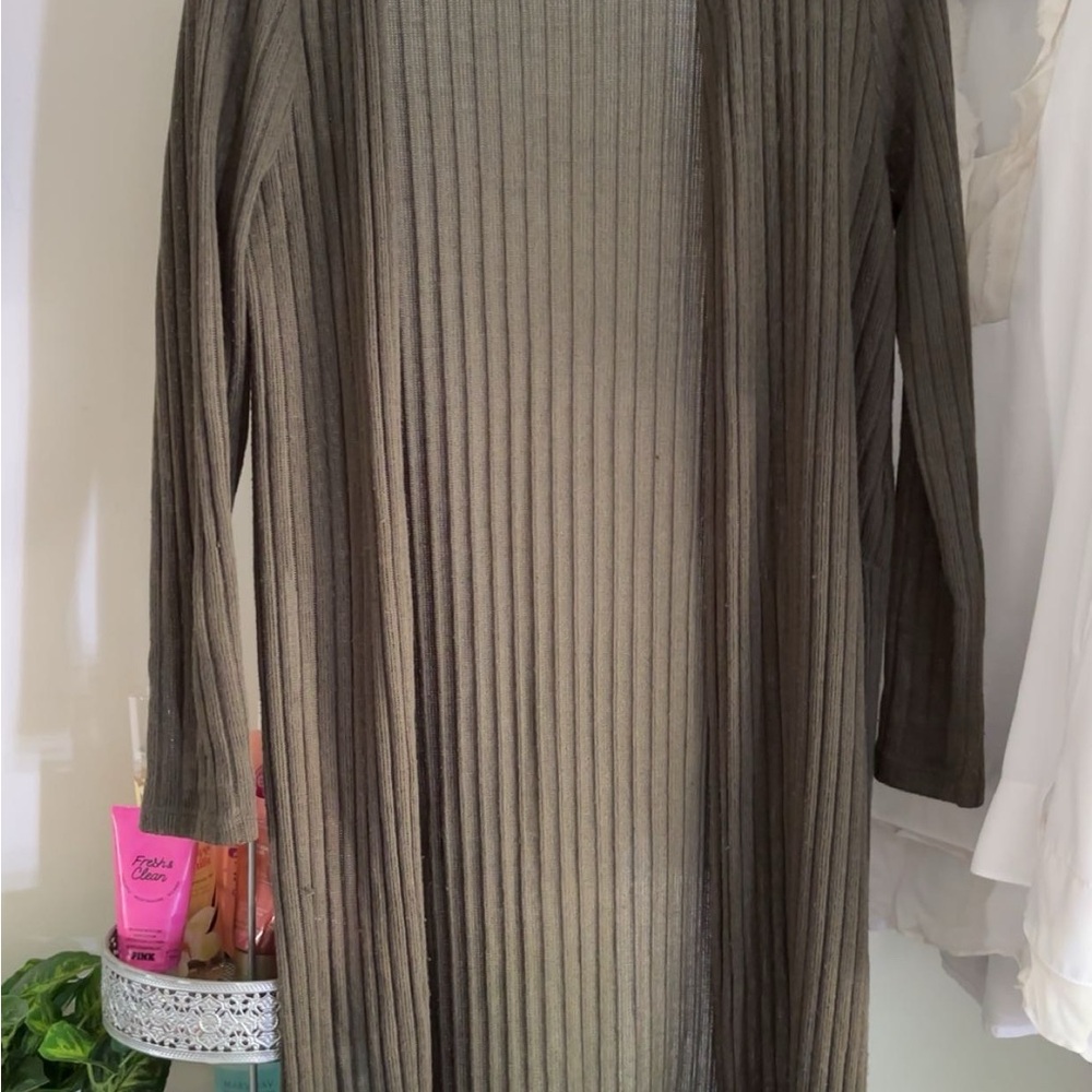 Stylish long ribbed cardigan in a versatile olive shade. Perfect for layering.
