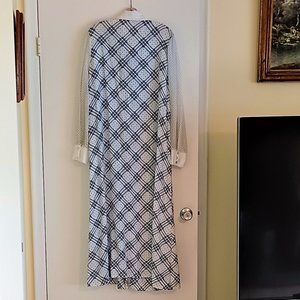 Long robe. Poly/cotton fabric. Machine washable. Blue and white. White collar and cuffs. Button down. Size large.