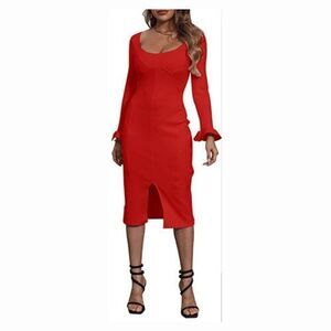 ❤️ Long Ruffle Sleeve Front Slit Bodycon Boat Neck Party Midi Red Dress M NEW
