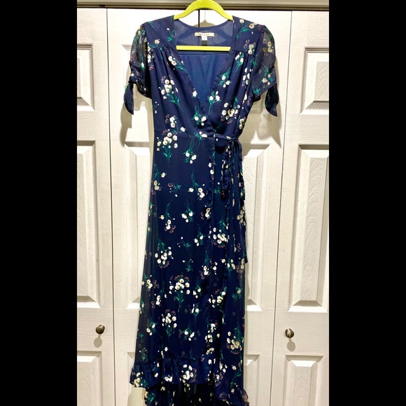 Navy Blue flowered polyester, lined dress(see photo showing the mini liner) the bottom of the dress is sheer so your legs sorta show through, shirt sleeves have trendy ties. Very flowy & comfy! Hand or machine wash. Perfect for spring or summer days after quarantine!