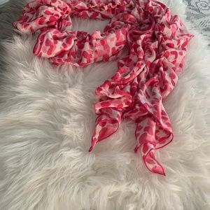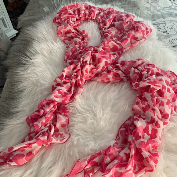 This beautiful, long 88”-92” Dotted scarf is triple-tiered on each side forming a ruffle down the full length due to a stretchy elastic. Easy care. Could be worn in multiple ways.