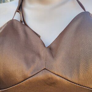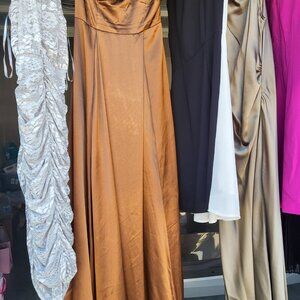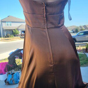 Satin dress with front opening and pockets. Dress ties at neck. Perfect for weddings and formal events. Worn once.