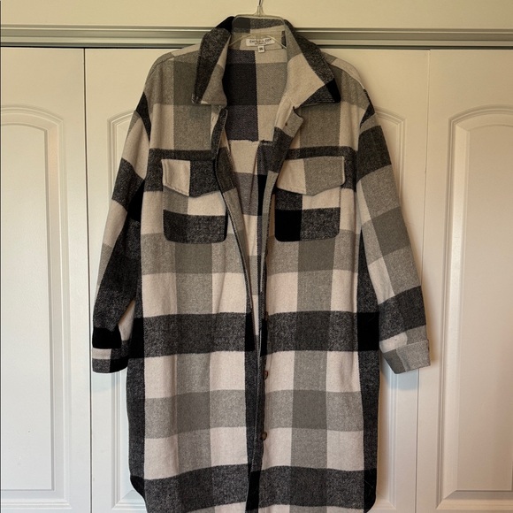 Stay stylish and warm with this plaid women's jacket. Featuring a classic black and gray design, it's perfect for any occasion.