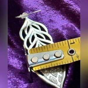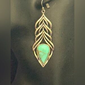 Long Silver Tone Earrings Faux Turquoise Teardrop Stone Cutout Design 1982 G