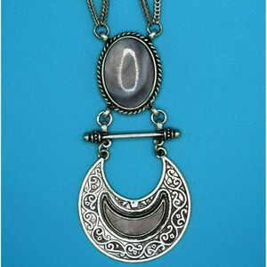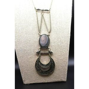 Long Silver Tone Faux Abalone Glass Stone Pendant Multi Tier Statement Necklace with lobster clasp