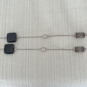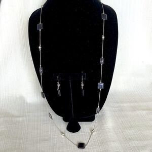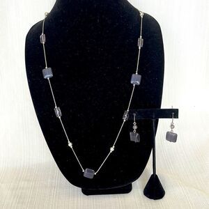 Long Silver Tone and Smoky Gray Crystal Necklace with Earring Set