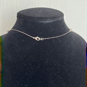 When worn, the necklace will lie symmetrical on your chest. The pattern of the necklace takes turn using a silver tone ball, squared smoky gray gem, silver tone ball and a smoky gray, rectangular crystal.