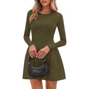 Long Sleeve Army Green Mini Dress Women Fall 2025 Crewneck Line Babydoll Casual