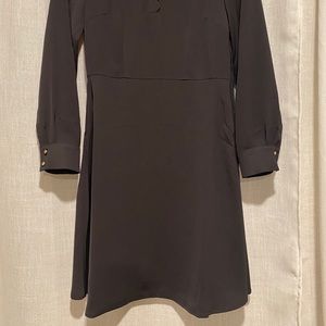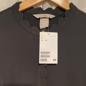 New with tags, pretty black dress with scallop detail around the collar and button top. There is a side zipper and little gold buttons.