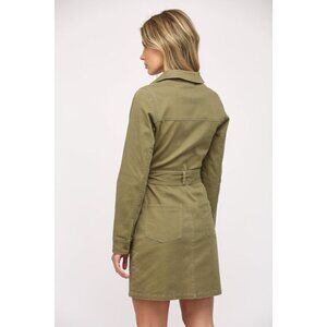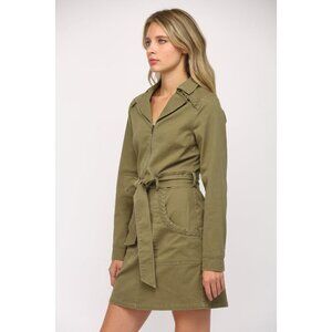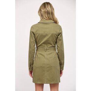 This adorable long-sleeved mini dress is designed with a self-belt, v-neckline, and braided seam details. This effortlessly cool dress is the perfect addition to your wardrobe, cut from soft denim with a hint of stretch in Vintage Green Forest. Slip into style with this trendy mini dress! Featuring a charming v-neckline, self-belt, and unique braided seam details, this dress effortlessly elevates any outfit. Made from soft denim with a touch of stretch, it's perfect for any occasion. Add a pop of Vintage Green Forest to your wardrobe and be ready to turn heads! 97%COTTON 3%SPANDEX