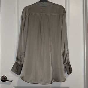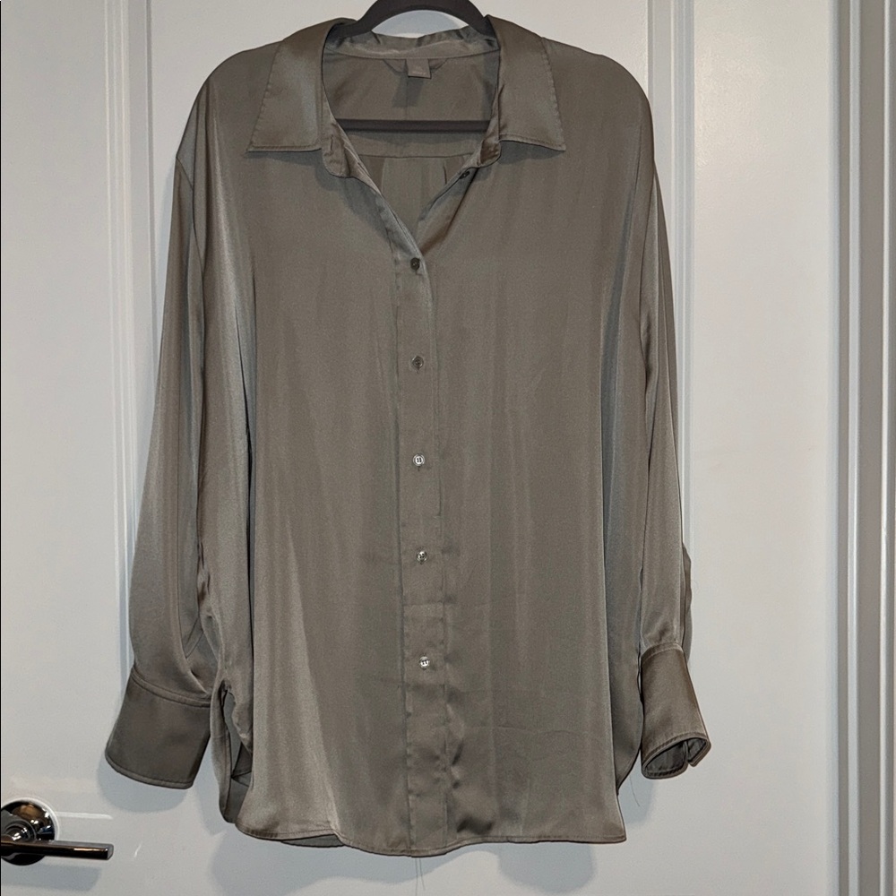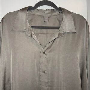 - Classic long-sleeve button-up shirt in gray. - Lightweight, smooth fabric with a relaxed fit for everyday comfort. - It was only worn once!