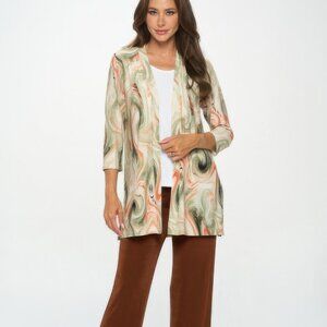 Designed for comfort and sophistication, this long sleeve cardigan combines lightweight drape with a bold printed finish. The stretch-knit fabric allows for all-day ease, while the open-front style layers effortlessly over tanks, tees, or blouses. Whether worn at home, work, or travel, this cardigan adds a polished layer to your wardrobe. Proudly made in the USA.