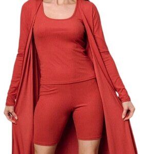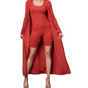 Annes Apparel Women`s Long Sleeve Cardigan with Tank Top and High Waist Shorts 3PC Set Comes in the Color Rust in the US Women Regular Size Small, Medium, and Large. The Material is 94% Polyester 6% Spandex for a comfortable feeling while wearing this outfit for any occasion during any season of the year no matter what the weather may be. Rest assured that you will feel calm and relaxed in this Long Sleeve Cardigan with Tank Top and High Waist Shorts 3PC. Set. The Model is wearing size small Tank Top Length: 21" Bust: 30" Waist: 13". Cardigan: Length: 55" Waist: 34" Inseam: 18". Shorts: Length: 20" Waist: 12" Inseam: 8". This Long Sleeve Cardigan with Tank Top and High Waist Shorts 3PC Set can be Hand Wash and Hang to Dry for Easily Maintained. Great Choice for Morning, Noon, and Night for the Desired Unisex. New Never Worn.