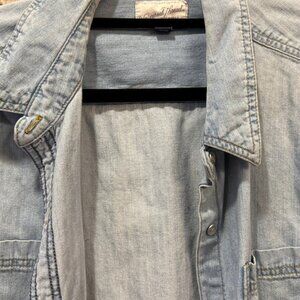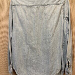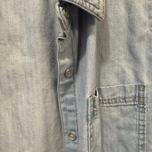 It has a classic collared neckline, button-down front, and two chest pockets with flaps and button closures. The denim has a slightly faded and worn appearance, suggesting a casual style. The sleeves are long with buttoned cuffs.