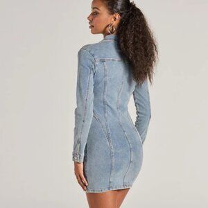 A denim mini zip dress with long sleeves and a bodycon silhouette. The fabric has some stretch, the sleeves have button cuffs and it has pretty stitching detail along the back that is very flattering. I usually wear a medium in Windsor and although it fit me, it was too snug for my liking. The first two images are off their website.