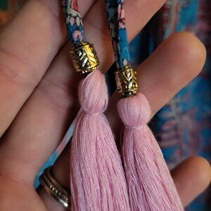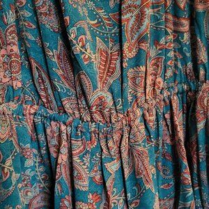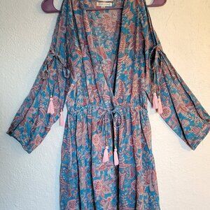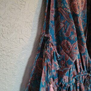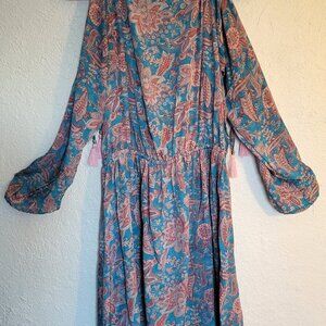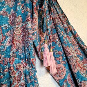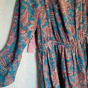This dreamy dress has open long sleeves that tie in the middle and have adorable pink tassels on all the ties. It is a cute floral paisley pattern in bright pink and blue with a touch of white. The front has a deep v neck with a cinched elastic waist. The brand is Karma Highway, one size.