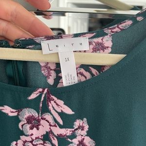 Long sleeve, knee length, green floral dress. Works for maternity.