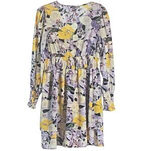 Long Sleeve Floral Mini Dress – Smocked Waist – Watercolor Print – Size Large